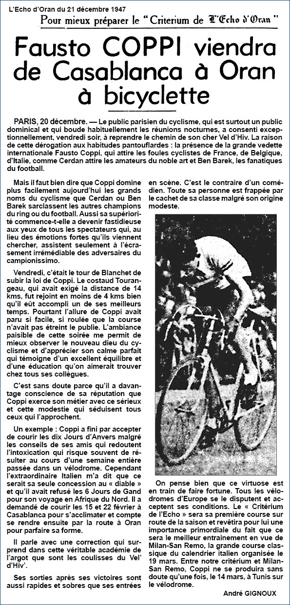 Fausto COPPI : Casa - Oran à vélo ?... (